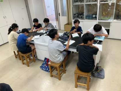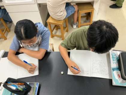 理科の時間です。月の形と、その変化は、どのようなものか、予想を立てています。
