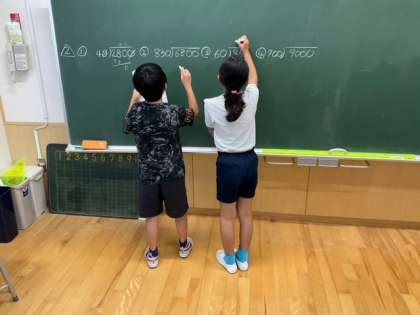 算数の時間です。わり算を工夫して計算しています。効率よく計算できるようにしましょう。