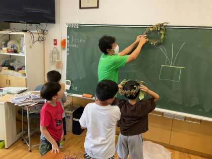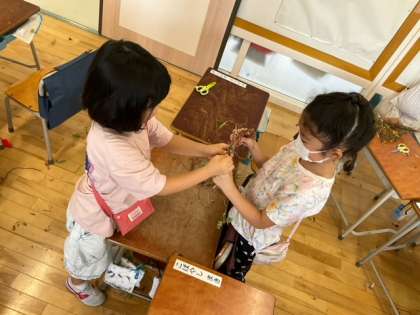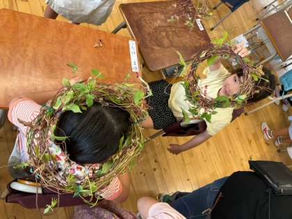 生活科の時間です。「あさがおのつるでリースづくり」すてきなリースができました!