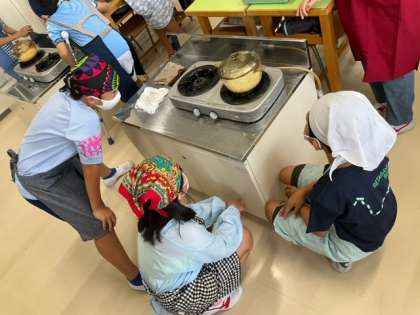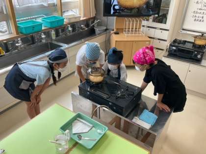 家庭科の時間です。「ご飯をおいしくたきあげよう」いい香りがしてきました。