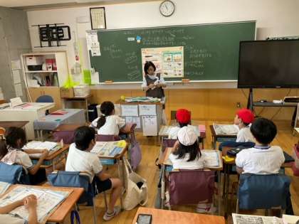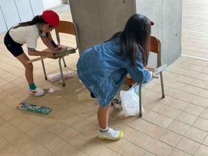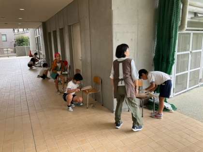 図工の時間です。「のこぎりひいてザクザクザク」のこぎりに挑戦しています。