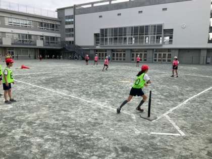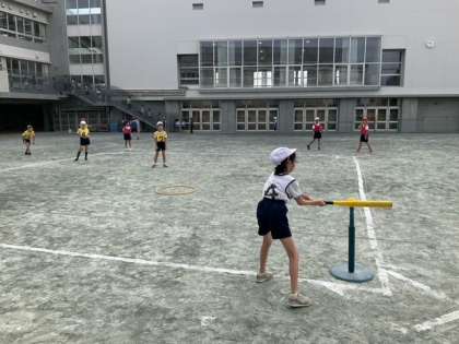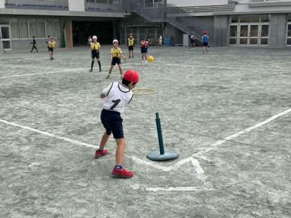 体育の時間です。Tボールの試合です。ジャイアンツの選手からの指導が生きていますね。