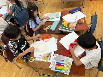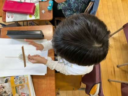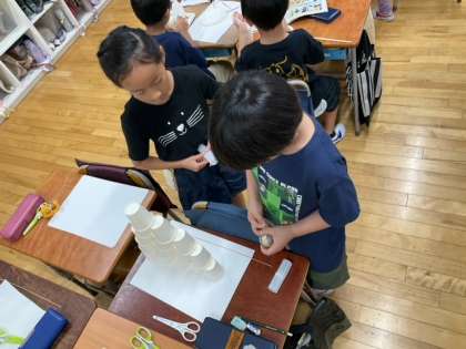 生活科の時間です。「あそんで ためして くふうして」いろいろな材料や道具を使って、どんな遊びができるかな?