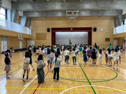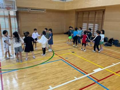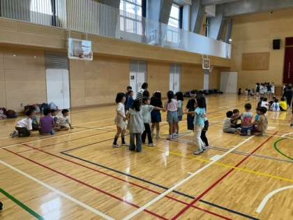 お弁当タイムのあとは、学年レクで盛り上がっています。猛獣狩りに行こうよ!