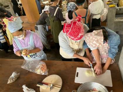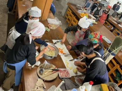 火が通りやすいように、具材の大きさを切りそろえています。玉ねぎと煙が目に染みますね。