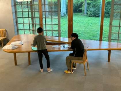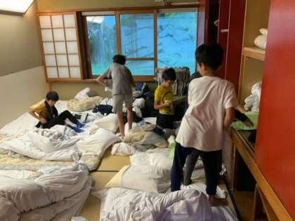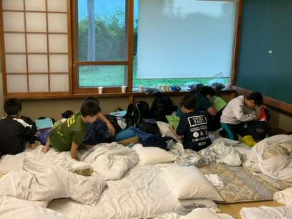起床の時刻になりました。健康観察をして、担当児童が健康カードを提出しています。さわやかな朝です。