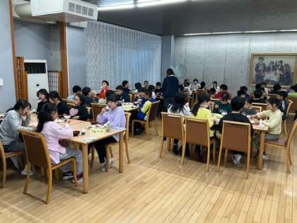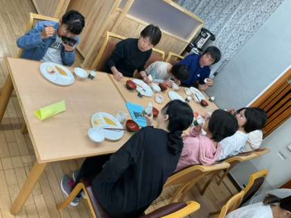 和やかな朝食風景です。今日は、ハイキング、箸づくり、キャンプファイヤーと盛りだくさんです。