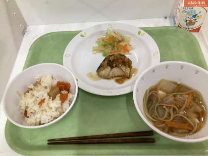 里芋ご飯 魚の南蛮焼き お浸し 明日葉麵入りすまし汁 牛乳