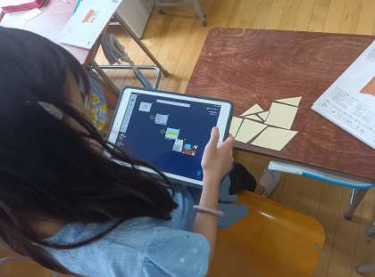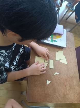 算数の時間です。さんかくとしかくを組み合わせて、いろいろな形を作ってみました。