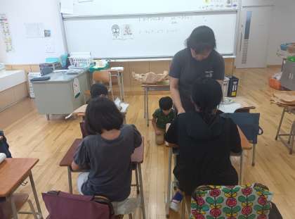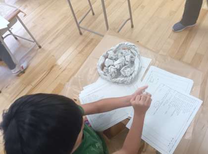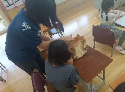図工の時間です。紙を丸めて、立体感を出しピザを作っています。ふっくらしていて、どんなピザができるか楽しみです。