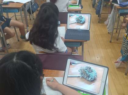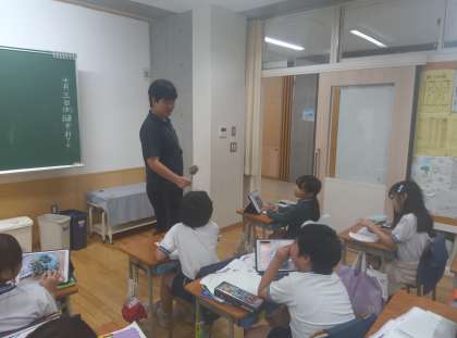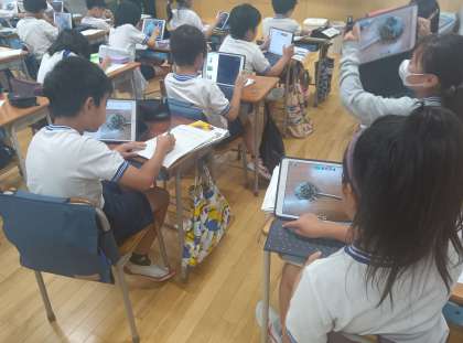 理科の時間です。3年生の初め頃に種をまいたひまわりが枯れて、種になっているところを観察しました。