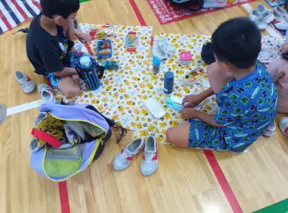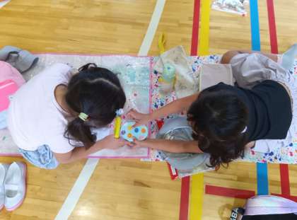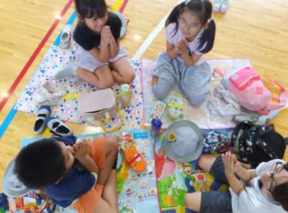 遠足が延期になってしまった1年生に少しでも楽しい気持ちを味わってもらおうと、体育館でお弁当を食べることにしました。