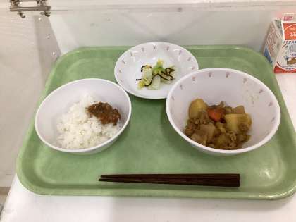 ごはん ひとめぼれ てっかみそ カレー肉じゃが 塩昆布あえ 牛乳