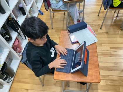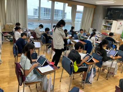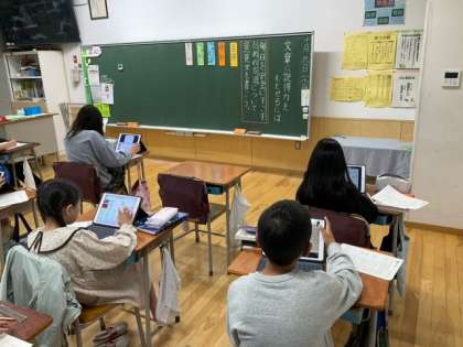 国語の時間です。意見文を書いています。文章に説得力をもたせるための工夫を考えています。