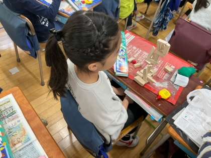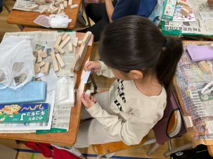 図工の時間です。のこぎりを使って切り出した材料を組み合わせて、思い思いの作品が形になってきました。