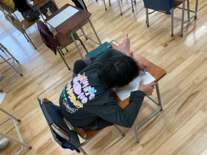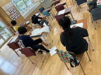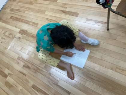 図工の時間です。「からだたんけん」手形や足形を写しとって、あれ、どんな絵になるのかな?