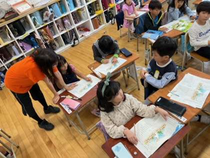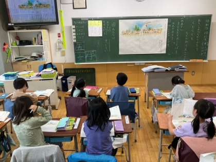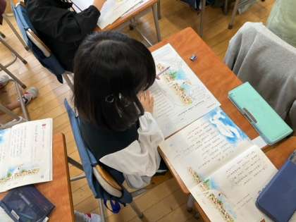 国語の時間です。「くじらぐも」文や挿絵から、作品に登場する子どもたちがどんな話をしているのか想像しています。