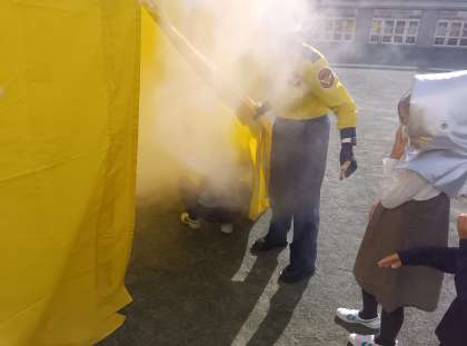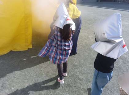 3年生と5年生、くるみ学級は避難訓練の後に煙中体験をしました。煙ハウスの中は本当に何も見えなくて、火事のときどのように避難すればよいかよく分かりました。
