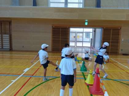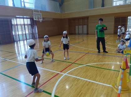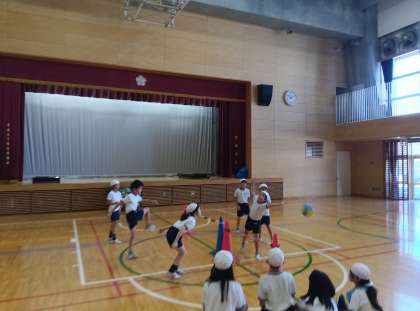 体育の時間です。プレルボールをしています。3人で上手にボールをつないで、相手のコートにアタックをしています。