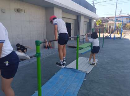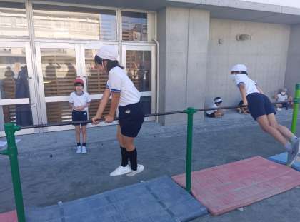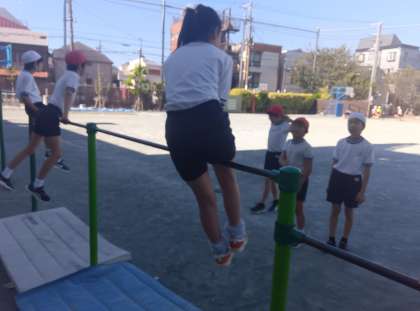 体育の時間です。自分のめあての技を練習しました。友達にアドバイスする姿も見られました。