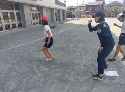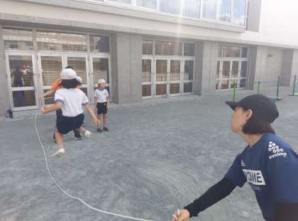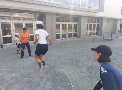 体育の時間です。長縄をよく見て、ジャーンプ。みんなの声に合わせて跳びました。