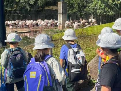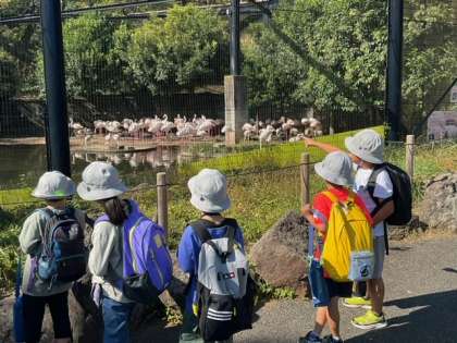 子どもたちの視線の先には、昼寝をしているライオンがいます。フラミンゴはいっぱいいました。