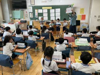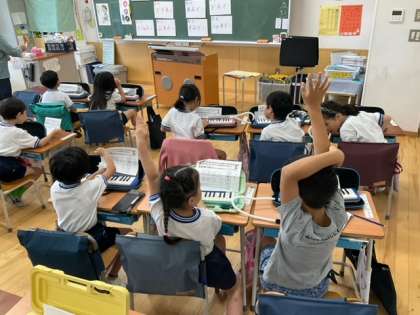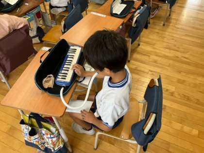 音楽の時間です。鍵盤ハーモニカで作ったメロディーを、友達とつなげて演奏していますね