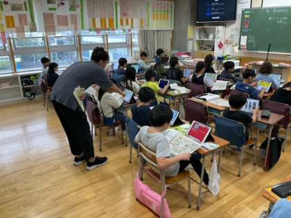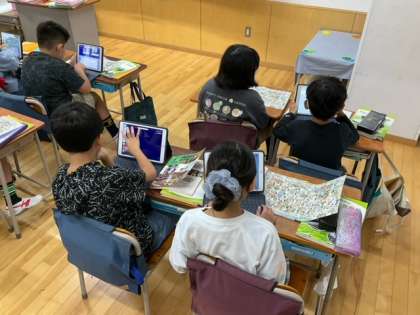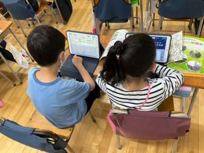 社会科の時間です。スーパーの工夫を予想しています。ロイロノートで考えを共有しています。