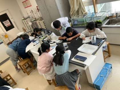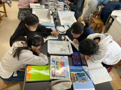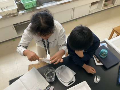 理科の時間です。ものがとける様子を観察しています。500mlの水に、1gの食塩をとかすと