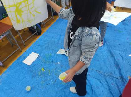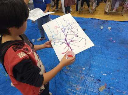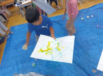 図工の時間です。絵の具をたらして、画用紙に表現しました。どんなかたちが見えてくるか楽しみです。