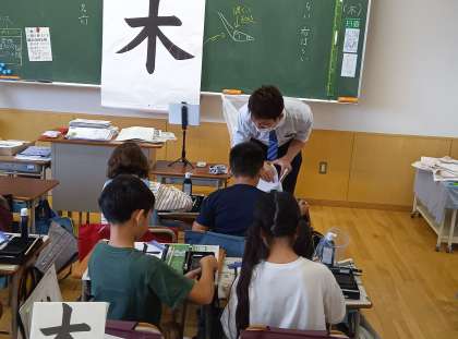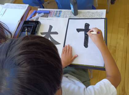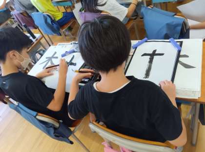 書写の時間です。はらいを意識して書きました。一画一画、真剣です。