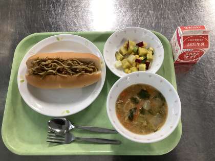 焼きそばパン さつまいもサラダ 白胡麻タンタンスープ 牛乳