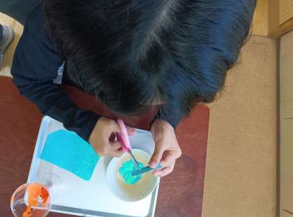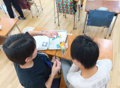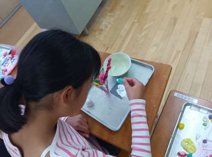 図工の時間です。紙粘土でトッピングを作り、パフェを作っています。とてもおいしそうです。