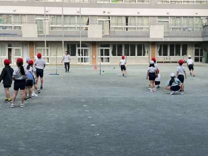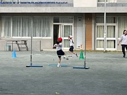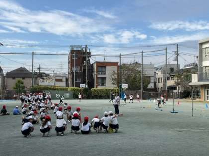 体育の時間です。校庭いっぱいを使って、いろいろな動きに挑戦しています。