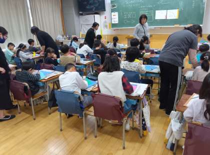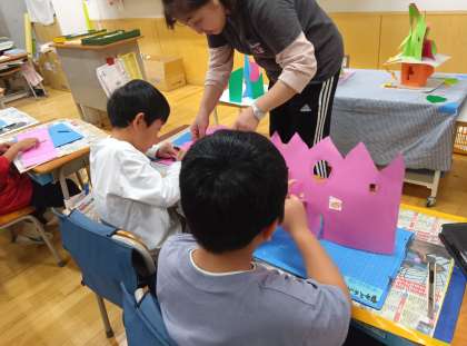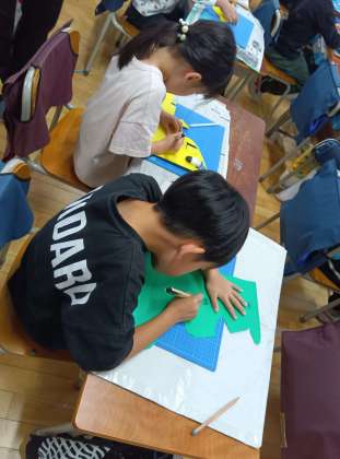 図工の時間です。カッターを使って、窓のあるたてものを作っています。お手伝いの方々のおかげで安心して、カッターを使うことができています。って
