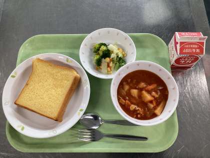 フレンチトースト ブロッコリーサラダ チキンのトマトシチュー 牛乳