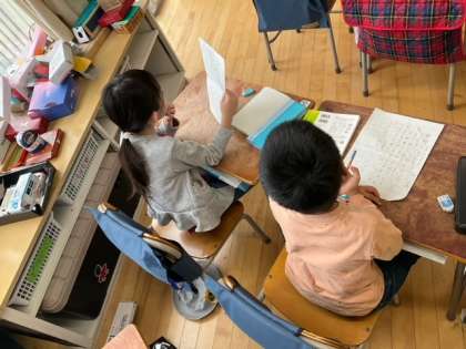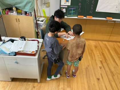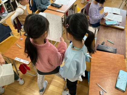 国語の時間です。知らせたいことを作文にしています。教え合いながら、よりよい内容にしていきます。