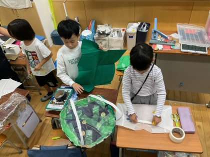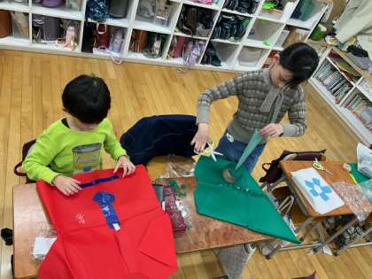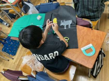 生活科の時間です。劇の衣装づくりをしています。自分の衣装です。いっぱい工夫しましょう。