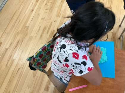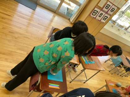 図工の時間です。体重をかけて、粘土を柔らかくしています。この仕込みが大事ですね。