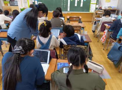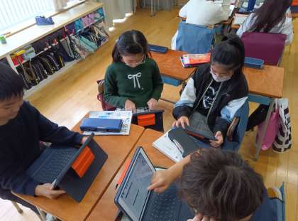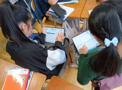 国語の時間です。身の回りの和語、漢語、外来語を調べてクイズを作りました。班で協力することで思いつかない言葉も分かりました。