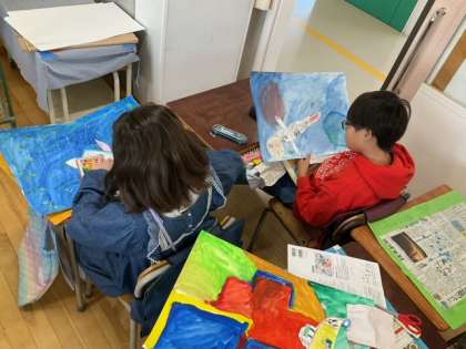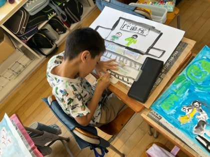 図工の時間です。個性あふれる「ふしぎな乗り物」が生み出されました。