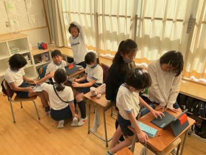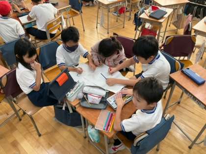 学級活動の時間です。自分たちの力で下北沢文化祭を盛り上げようと、ポスターづくりに取り組んでいます。