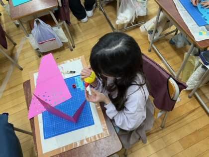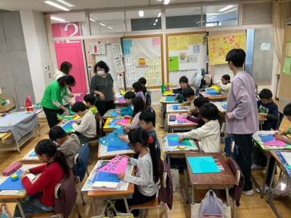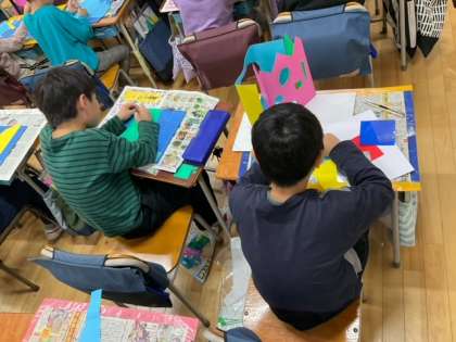 図工の時間です。「まどのある たてもの」いろいろな窓がありますね。