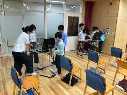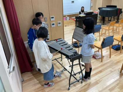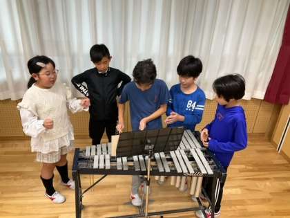 音楽の時間です。「ストドラパンパ」リズムに気をつけて、グループでストドラパンパに挑戦しています。