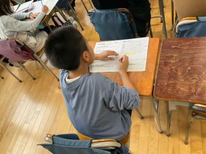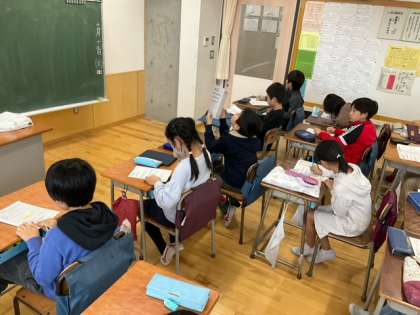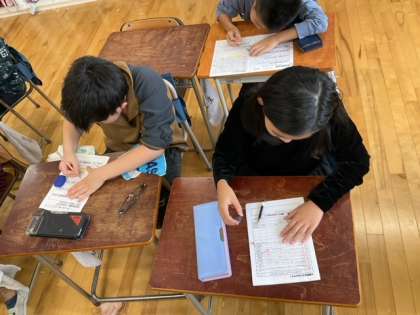 学級活動の時間です。下北沢文化祭「一致団結」カードに、文化祭の振り返りを記入しています。