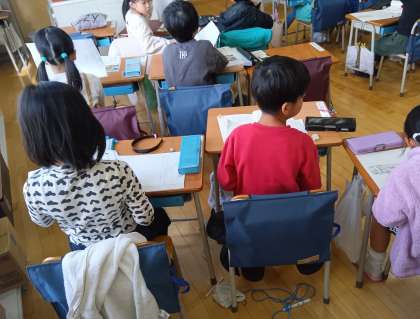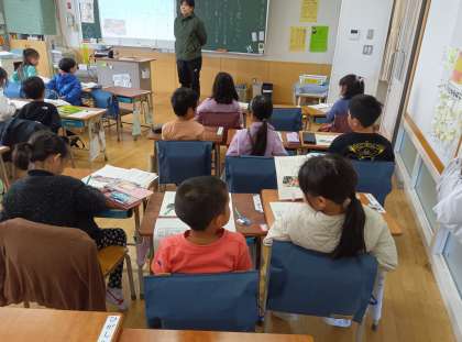 国語の時間です。バスや乗用車がどんな仕事をしているか、そのためにどんなつくりになっているか学習しました。