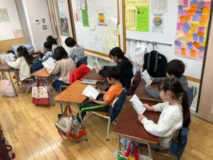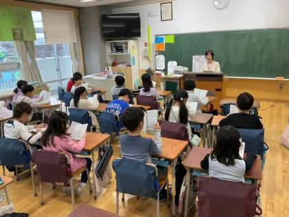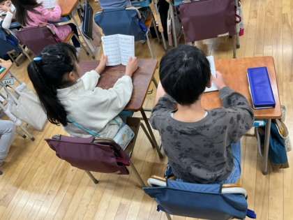 音楽の時間です。元気いっぱいに「きたかぜこぞうのかんたろう」を歌っています。