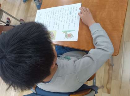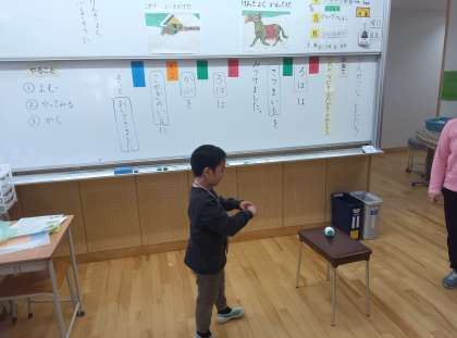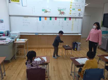 国語の時間です。誰が何をしたかをとらえて、読みました。また、その情景を想像してやってみました。