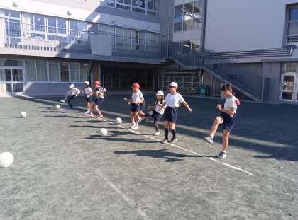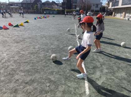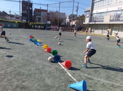 体育の時間です。正確に強く蹴ることができるようにカラーコーンを使ってゲームをしました。