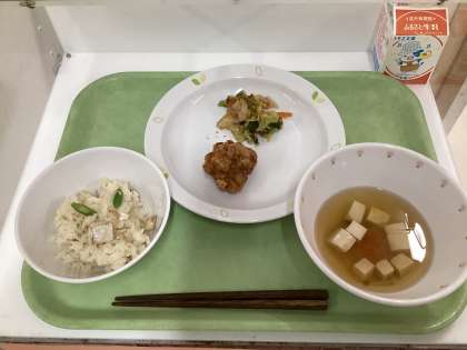 鯛めし 鶏の唐揚げ 白菜のおかかあえ お祝い汁 牛乳